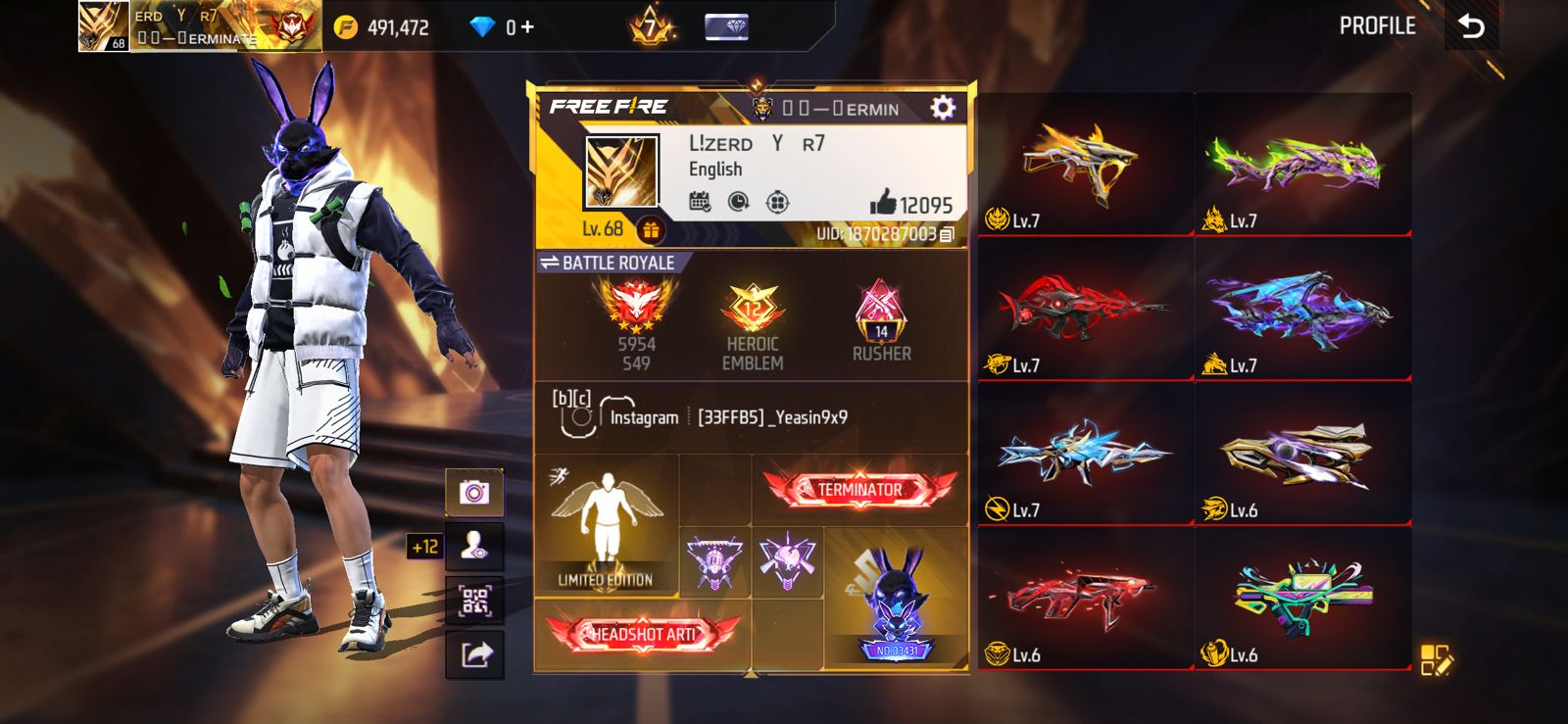 5 Evo max , 68 level free fire id